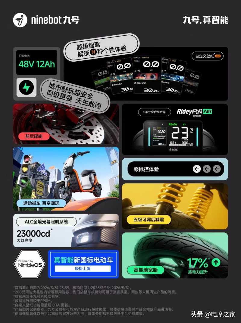 - 智能:升级 RideyFUN 智驾系统、TFT 高清彩屏、玩家模式(可调油门 / 动能回收)